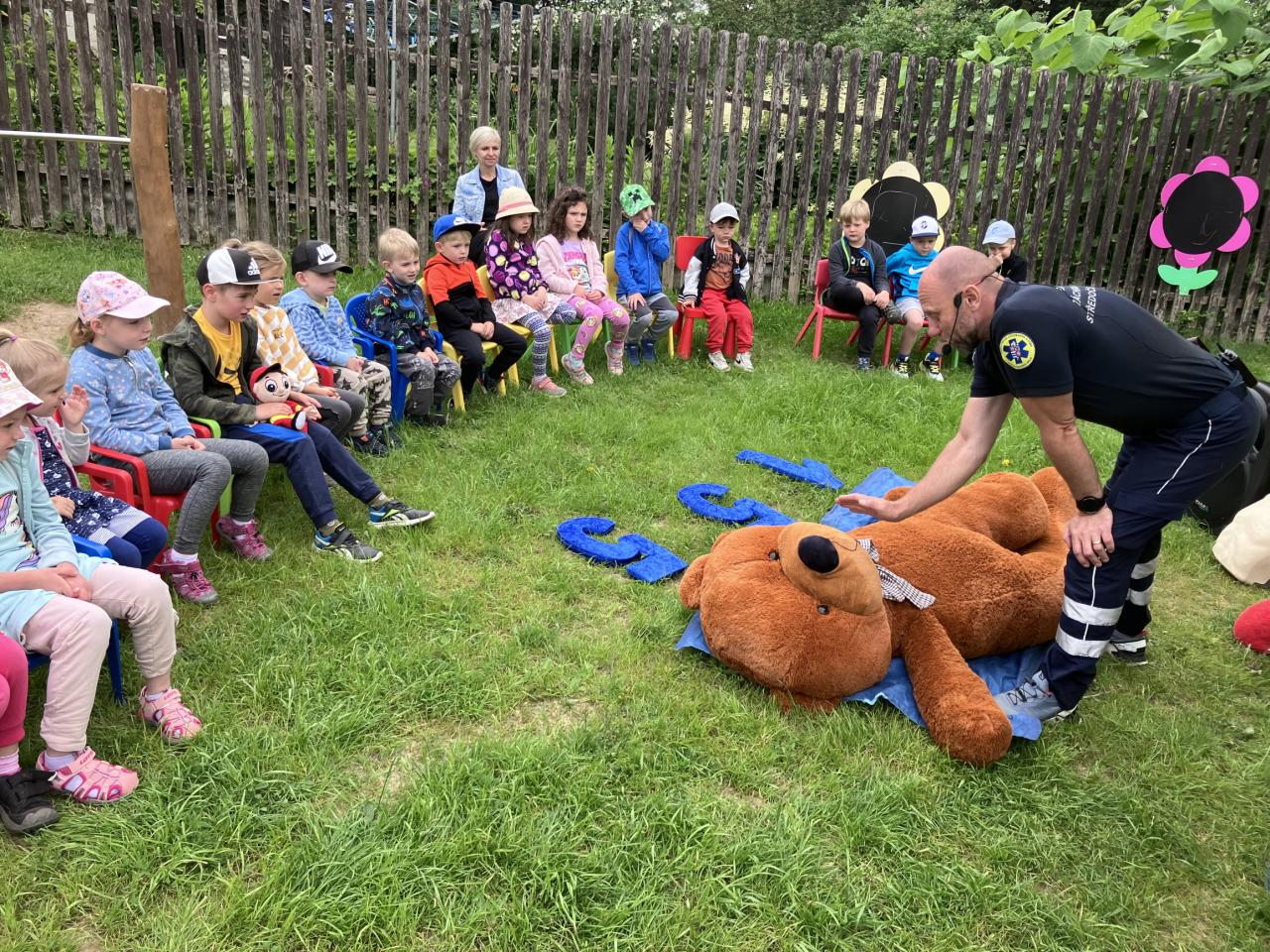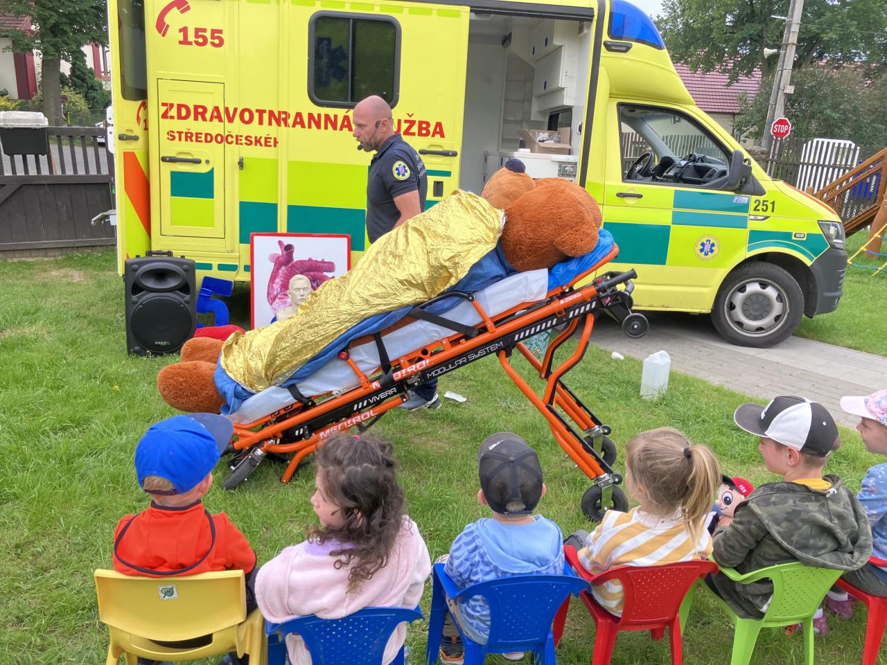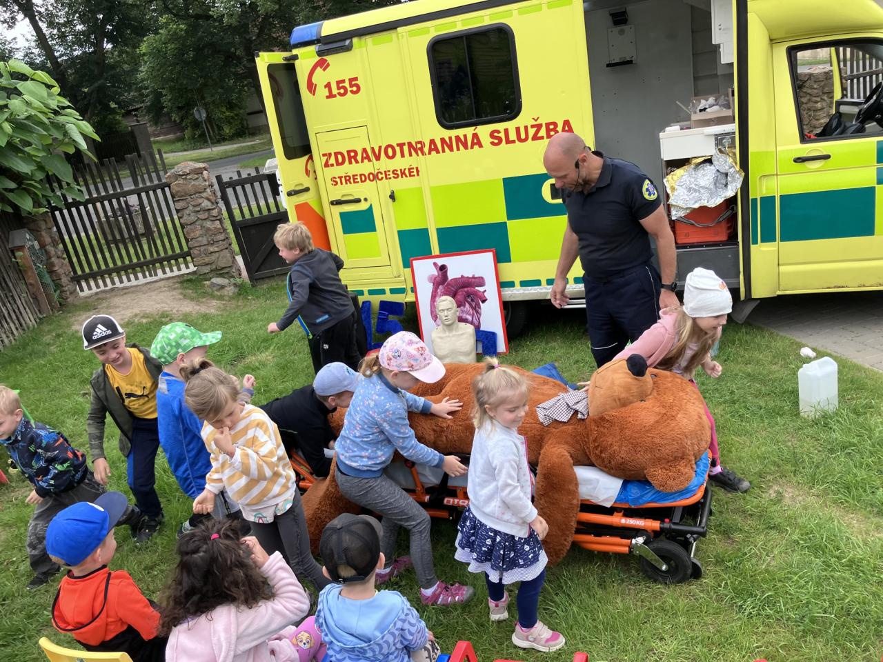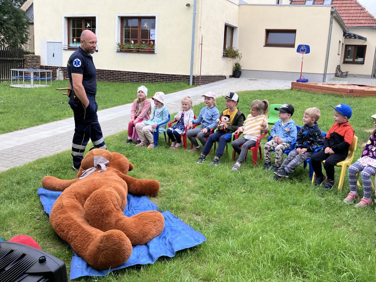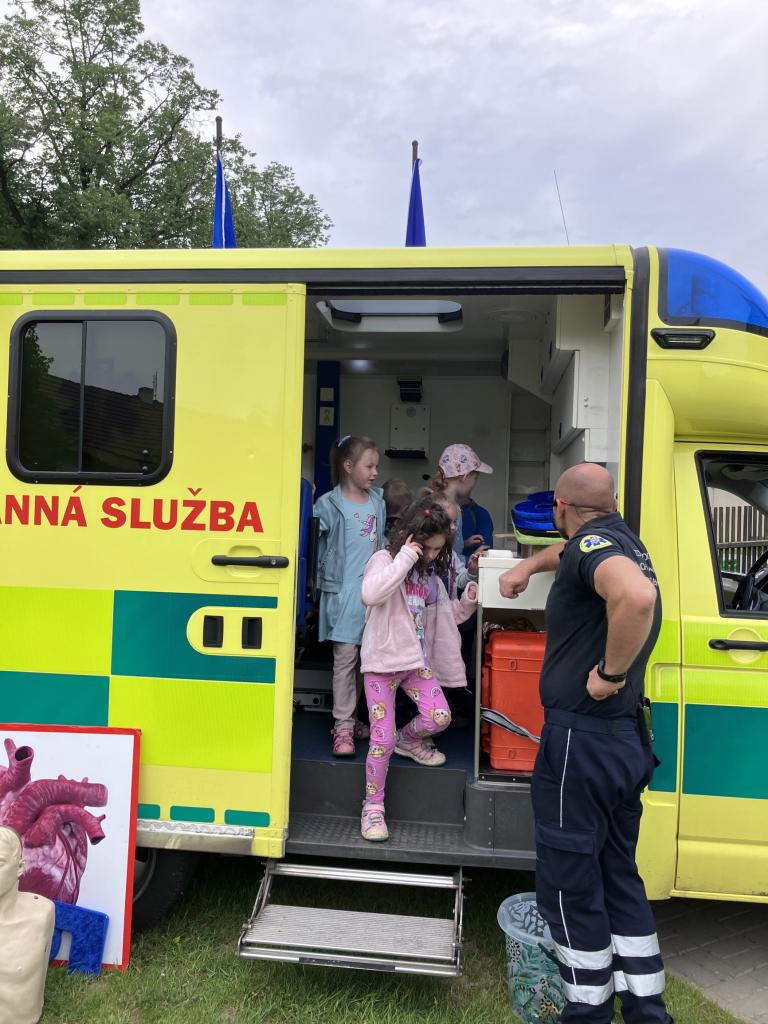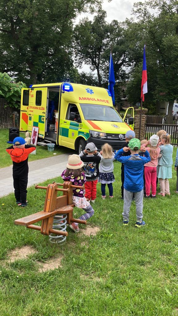 V pondělí 10.6. dopoledne jsme měli na zahradě moc pěknou besedu o první pomoci se záchranářem - nechyběla ani sanitka ani medvěd Míša, na kterém si děti vyzkoušely své dovednosti.
